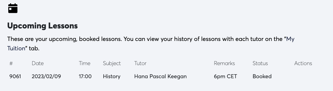 Once you have completed the lesson, your tutor will change the status of the lesson to 'Complete' which you will also be able to view on the Portal by clicking on 'My Tuition' on the left hand sidebar and clicking on the subject for which you want to see the lessons for.