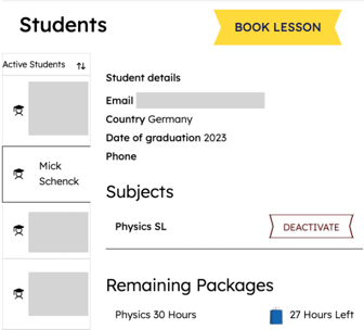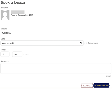 4. Select "Book Lesson" once you have chosen which student you wish to have a lesson with (you may be linked to a student for multiple subjects).