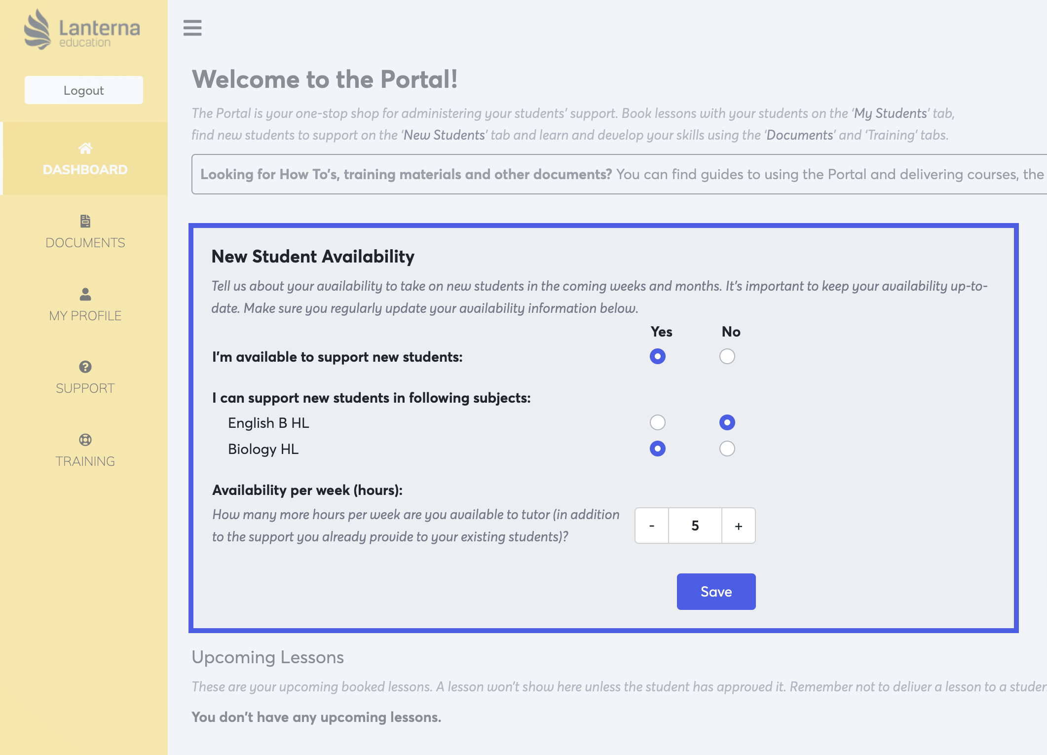 This section allows you to tell us how available you are take on new students. We refer to this information regularly when considering applications from tutors to take on new students, and so you should ensure you keep this information up-to-date.